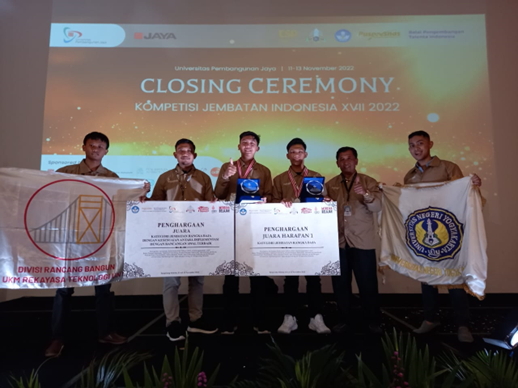 Tim Wisanggeni yang beranggotakan Arif Adika Angga Pratama (D-IV Teknik Sipil 2020), Anggi Dwi Septianingrum (S1 Teknik Sipil 2020), dan Muhammad Reza Pahlevi (D-IV Teknik Sipil 2021) dengan dosen pembimbing Ir. Dian Eksana Wibowo, S.T., M.Eng. berhasil memperoleh juara 3 dalam Lomba Tender Nasional dalam rangkaian acara Civil Zone 2022 di Universitas Mataram.