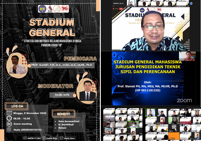 Stadium General is an annual public lecture held by the Student Association of Civil Engineering and Planning, Faculty of Engineering, Universitas Negeri Yogyakarta. In general, the material presented in this public lecture is material in the field of civil engineering which is suited with the current condition with the theme of "Strategies and Student Motivation during the Covid-19 Pandemic".