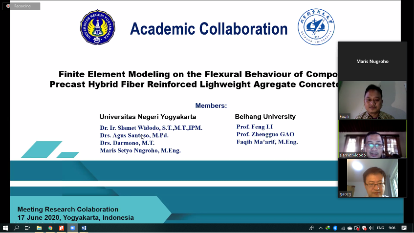 FT UNY (18/11/2020)-Jurusan Pendidikan Teknik Sipil dan Perencanaan kembangkan program kolaborasi akademik dengan Beihang University, Beijing-Tiongkok. Kegiatan ini dilaksanakan sejak Maret sampai dengan November 2020. Kegiatan ini bertujuan untuk meningkatkan cakrawala akademik dan peningkatan kualitas pendidikan. Beragam aktivitas yang telah dilaksanakan meliputi guest lecturer, visiting professor, visiting researcher, joint research and publication.